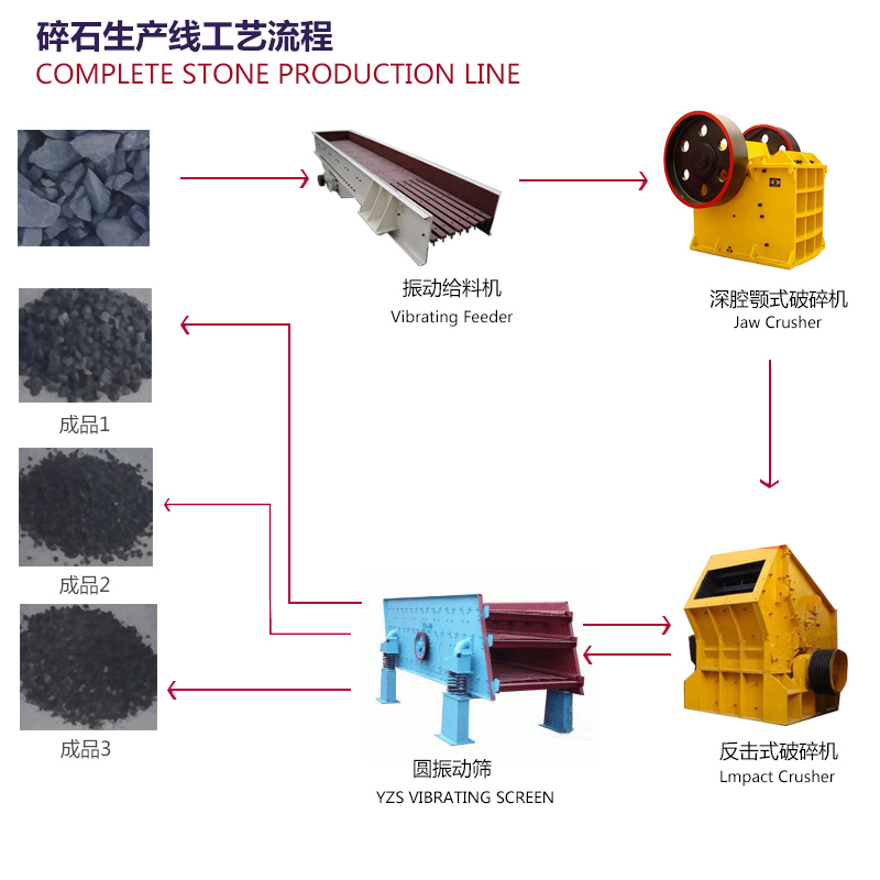 石料由给料机给入初破用的颚式破碎机,经过鄂破粗碎后,石子由振动筛进行筛分,适宜粒度的石子被排出生产线,送往成品料堆,不达要求的石子被送液压开箱破碎机重新破碎。