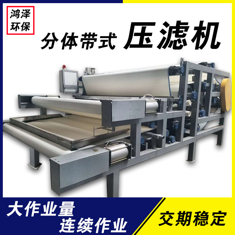 卧式带式压滤机,其共同的流程是环形滤布以移动在水平滤布外表输出的污泥半固体(或为液体等)被重力脱水,接着用压榨辊加压,使悬卷在两块滤布之间过滤,然后再用卷在几根辊筒上的滤布使用其外表压力到达彻底脱水。在卷有滤布的辊筒摆放基础上,紧缩滤饼顺序回转,使用辊筒外表上内侧和外侧的速度差,堵截紧缩滤饼。