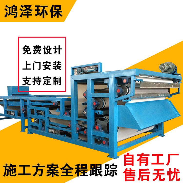 污泥经泵送入污泥拌和槽内与高分子凝聚剂(polymer)混合效果后,使污泥中细小的悬浮状颗粒经高分子凝聚剂的架桥效果构成胶乳状较大的颗粒,在泥耙的双向导疏和重力效果下,污泥跟着滤布的移动,敏捷脱去污泥的游离水。