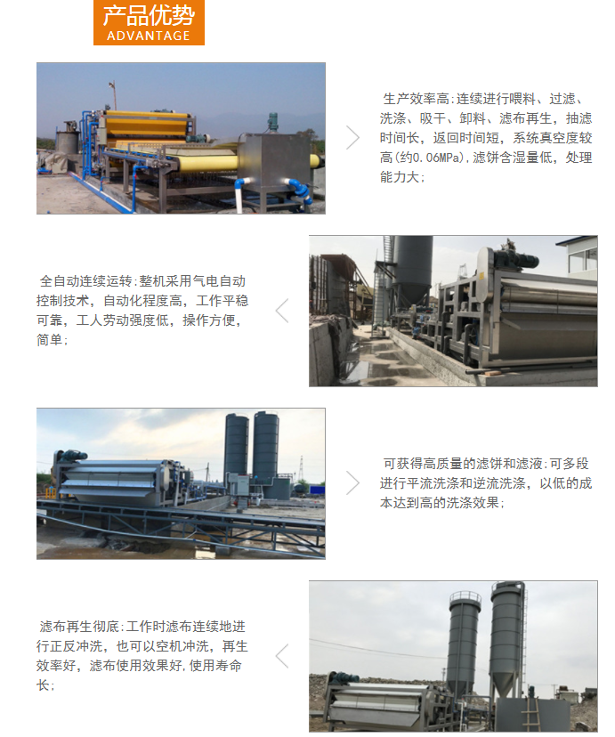 一、泥饼含水率低。每个滤室都能形成超强压力,以高于常规压力10-20倍的压力对污泥进行机械压干,从而轻易将污泥脱水。脱水后的泥饼含水率为百分之三十,不粘连滤布。