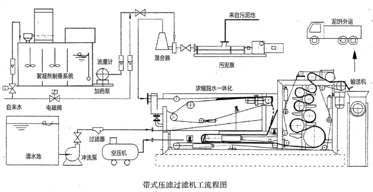 经过沉淀的污泥在与一定的浓度的絮凝剂在静、动态混合器中充分混合以后再污泥中的微小固体颗粒凝聚成体积较大的絮状团块,同时分离出水,絮凝后的污泥被输送大重力脱水是滤带上,在重力的作用下水被分离,形成不流动状态的污泥。然后夹持在上下两条网带之间,经过过预压区,低压区和高压区由小到大的挤压力,剪切力的作用下,进一步挤压污泥,达到大的程度的泥、水分离,后形成滤饼排出。