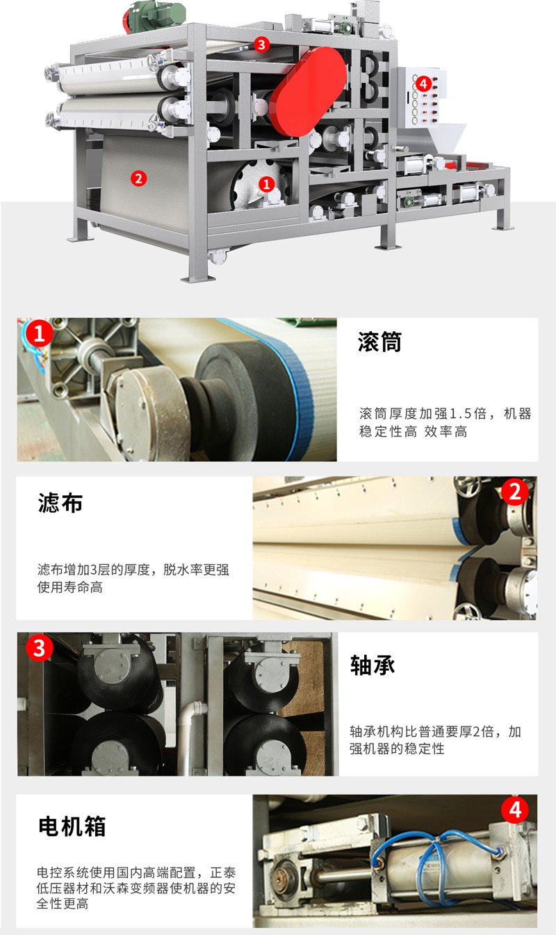 3、多辊径递减式积压辊,布局紧凑、滤饼含固量高。