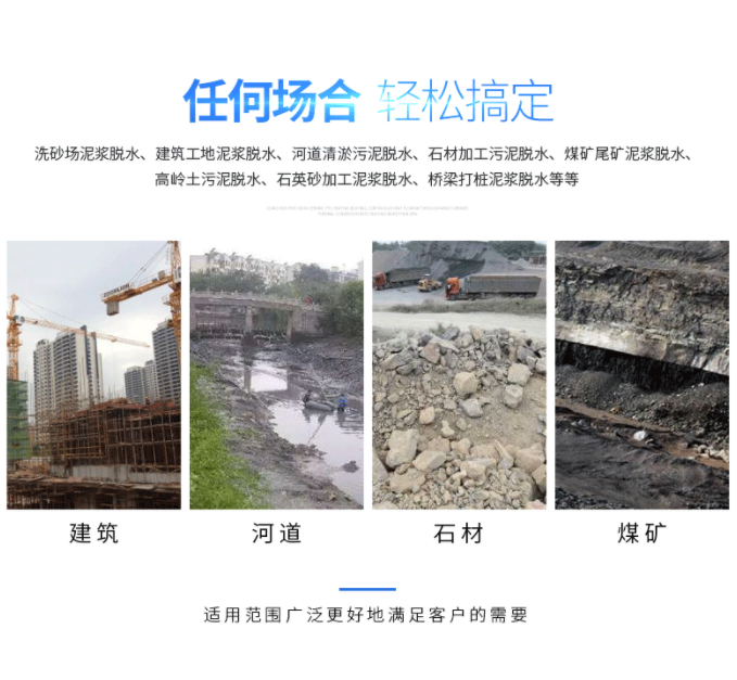 适用物料:打桩泥浆、制砂污泥、洗沙尾矿污泥、洗煤污泥、生活污泥、湖泊污泥、河道污泥等