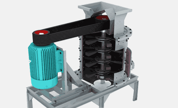 物料由进料斗进入制沙机,经分料器将物料分成两部分,一部分由分料器中间进入高速旋转的叶轮中,在叶轮内被迅速加速,其加速度可达数百倍重力加速度,然后以60-70米/秒的速度从叶轮三个均布的流道内抛射出去,首先同由分料器四周落下的一部分物料冲击破碎,然后一起冲击到涡支腔内物料衬层上,被物料衬层反弹,斜向上冲击到涡动腔的顶部,又改变其运动方向,偏转向下运动,从叶轮流道发射出来的物料形成连续的物料幕。